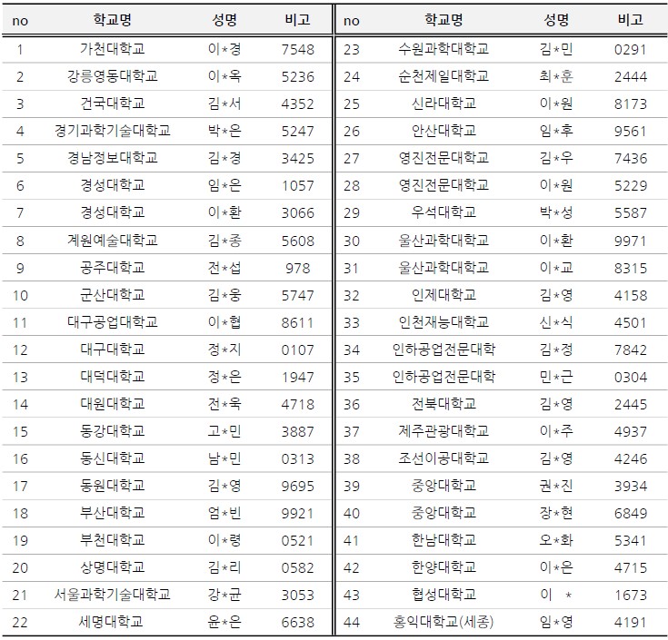 * 상기 표는 학교명기준 가나다순으로 작성되었음.